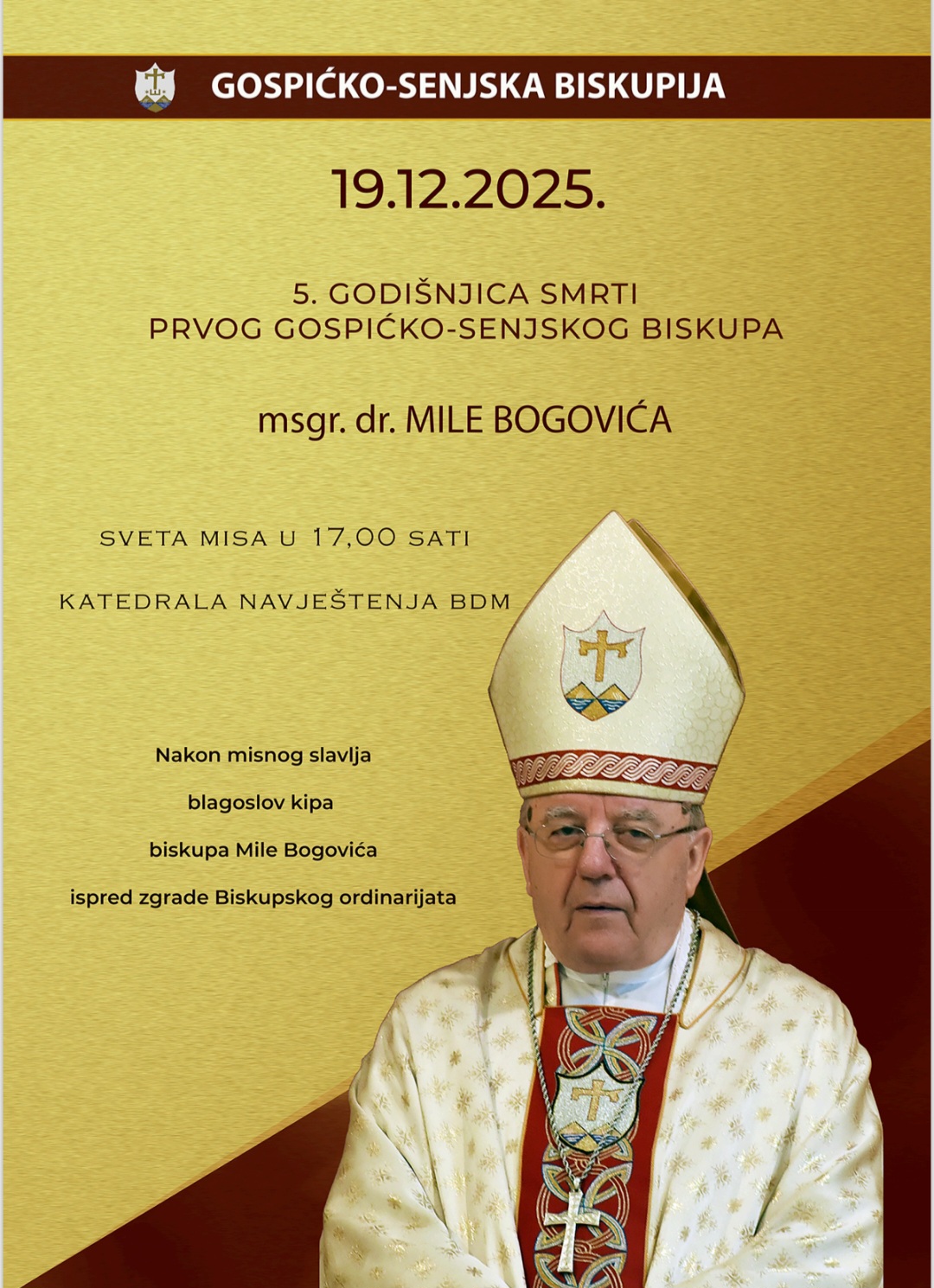 U petak, 19. prosinca, u gospićkoj katedrali svečanim misnim slavljem u 17 sati obilježit će se peta godišnjica smrti prvog gospićko-senjskog biskupa, mons. dr. Mile Bogovića.