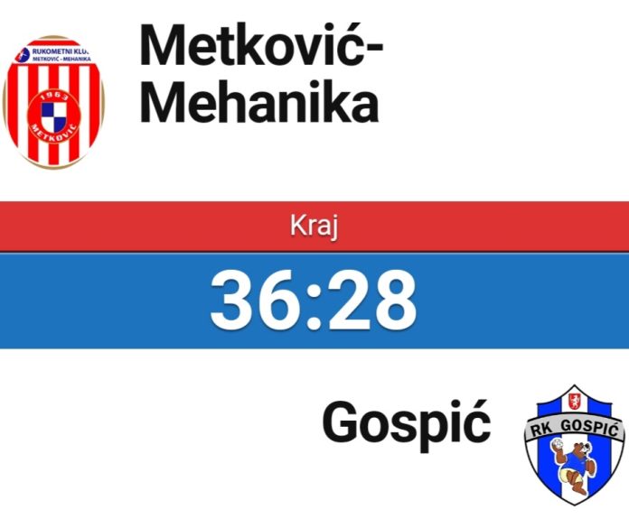 RK METKOVIĆ-MEHANIKA – RK GOSPIĆ 36:28 (17:10) – Markić (9), Jelić (3), Antić (3), Dželalija (3), Sakić (2), Suknaić (2), Čović (2), Seferagić (2), Petrović (1), Kolačvić (1)