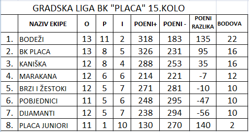 U neizvjesnoj završnici za 2. i 3. mjesto boriti će se ekipe BK Placa, Kaniška i Marakana. Završno kolo će se igrati 30.09., dopuste li vremenski uvjeti.