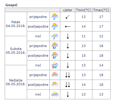 Promjenljivo oblačno povremeno uz kišu, a bit će i pljuskova s grmljavinom, ponajprije u gorskim predjelima i u unutrašnjosti Dalmacije. Vjetar slab i umjeren sjeveroistočni, na Jadranu bura i sjeverozapadnjak. Najniža jutarnja temperatura od 13 do 18, a najviša dnevna od 21 do 26°C, u Slavoniji i Baranji i koji stupanj viša.