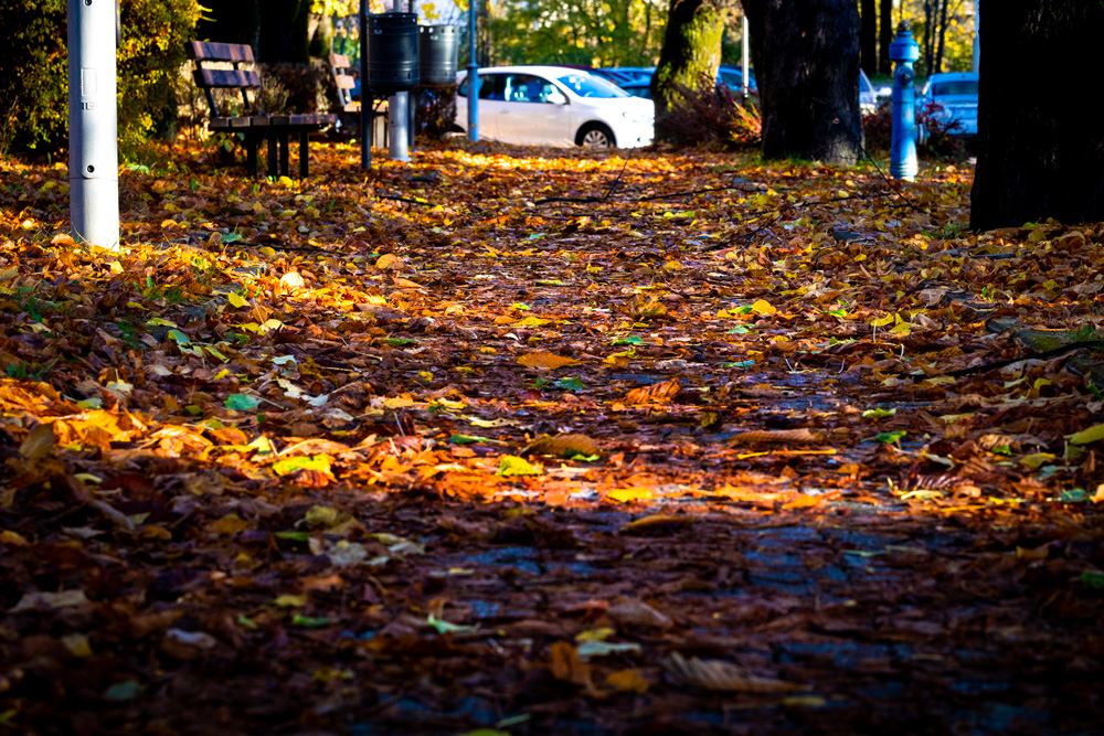 Jesen u Lici ima tišinu koja šušti pod nogama. Na jutros zabilježenim fotografijama na gospićkim ulicama lišće kestena stvara mek tepih, a nisko sunce povlači zlatne pruge preko staza. Nakon kiše sve se miriše jače: mahovina blista, sitni sporofiti strše poput minijaturnih svjetionika, gljive izviruju iz vlažne sjene, a koštice kestena pod kapljicama izgledaju kao sitni žeravni. Ulične klupe uronjene su u topli kolorit koji svaki kadar pretvara u razglednicu.