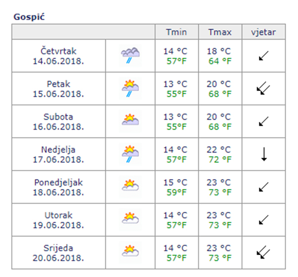 Promjenljivo oblačno, na Jadranu uz sunčana razdoblja te razmjereno vjetrovito. Povremeno može biti kiše i pljuskova, češće na istoku i jugu zemlje. Puhat će većinom umjeren, na udare i jak sjeverni i sjeveroistočni vjetar. Na Jadranu umjerena i jaka bura, podno Velebita s olujnim udarima, a poslijepodne prema otvorenom moru i sjeverozapadnjak. Najniža jutarnja temperatura uglavnom od 12 do 17, na Jadranu od 18 do 21, a najviša dnevna između 19 i 24, na Jadranu 25 i 28 °C.