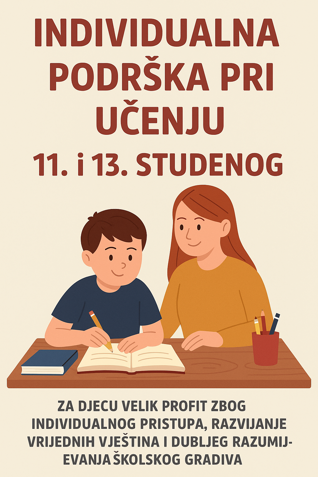 Individualna podrška omogućuje djetetu da u sigurnom, mirnom i poticajnom okruženju izrazi svoje poteškoće, postavlja pitanja i napreduje vlastitim ritmom. To je korak prema djetetu koje uči s radošću, a ne pod pritiskom.