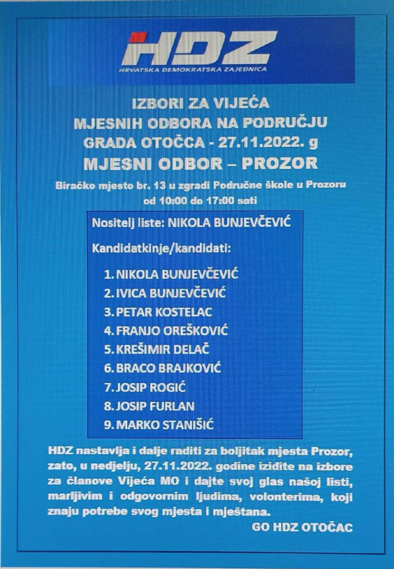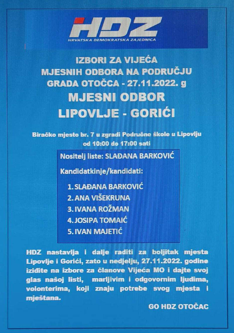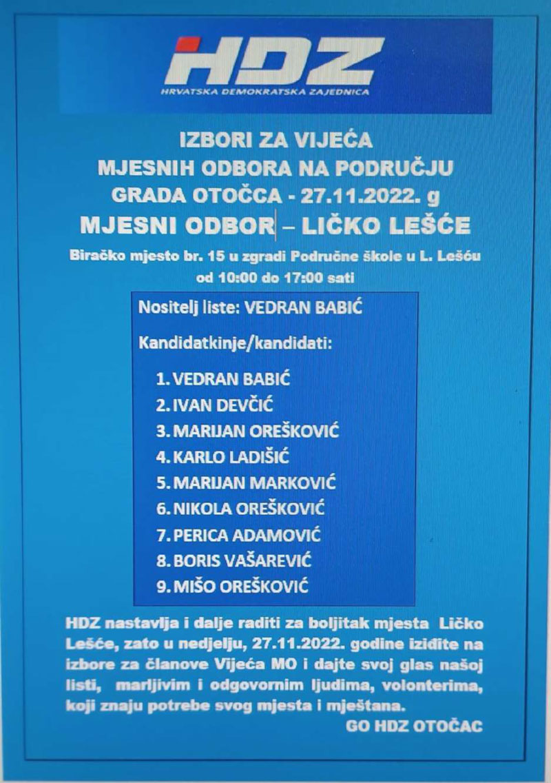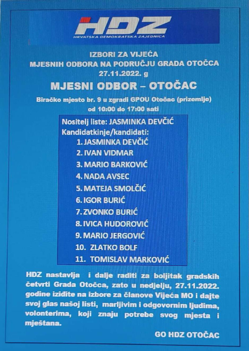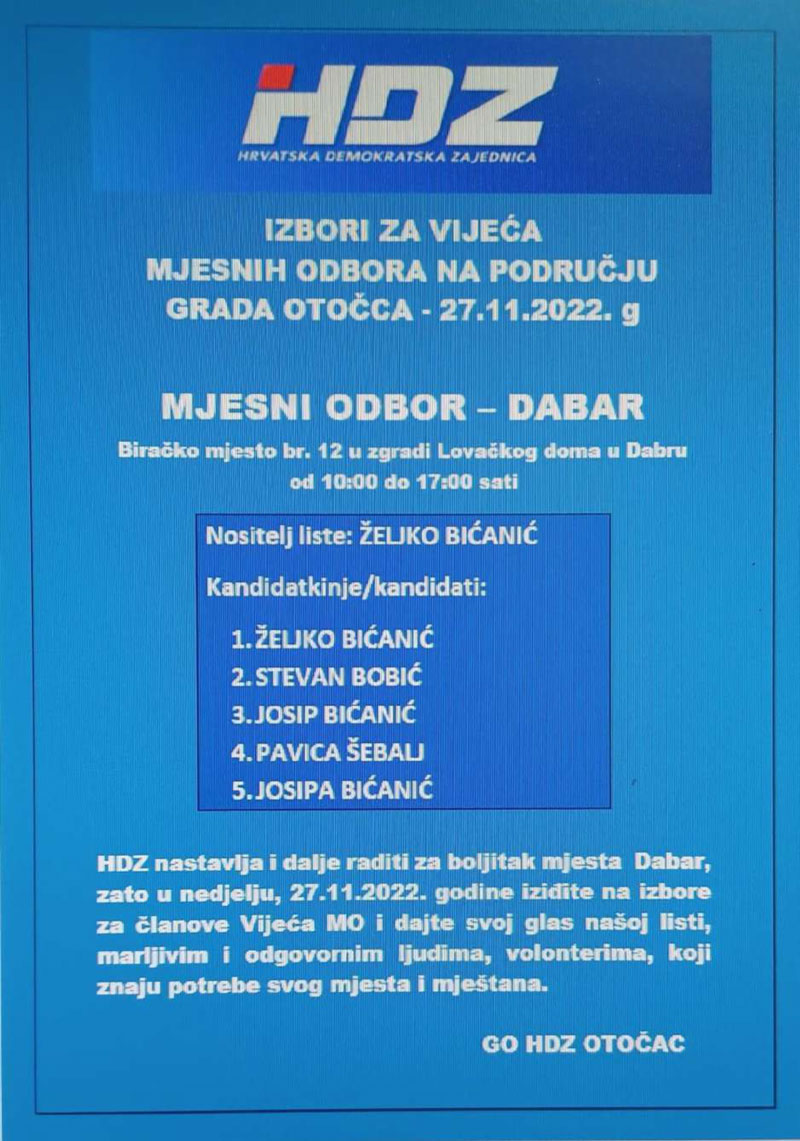 HDZ izlazi samostalno na ove izbore, a svoje kandidacijske liste predao je u 12 Mjesnih odbora od ukupno 17 i to za: Otočac, Ličko Lešće, Čovići, Sinac, Ramljane, Prozor, Švicu, Lipovlje i Goriće, Brlog i Brlošku Dubravu, Hrvatsko Polje, Dabar i Kompolje. Na listama su kandidati – vaši susjedi i mještani, ljudi koje dobro poznajete i koji će se u budućnosti brinuti za boljitak vaše ulice i kvarta, vašeg mjesta, ali i za bolje uvjete života svih naših sugrađana.