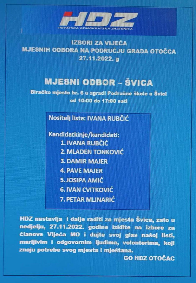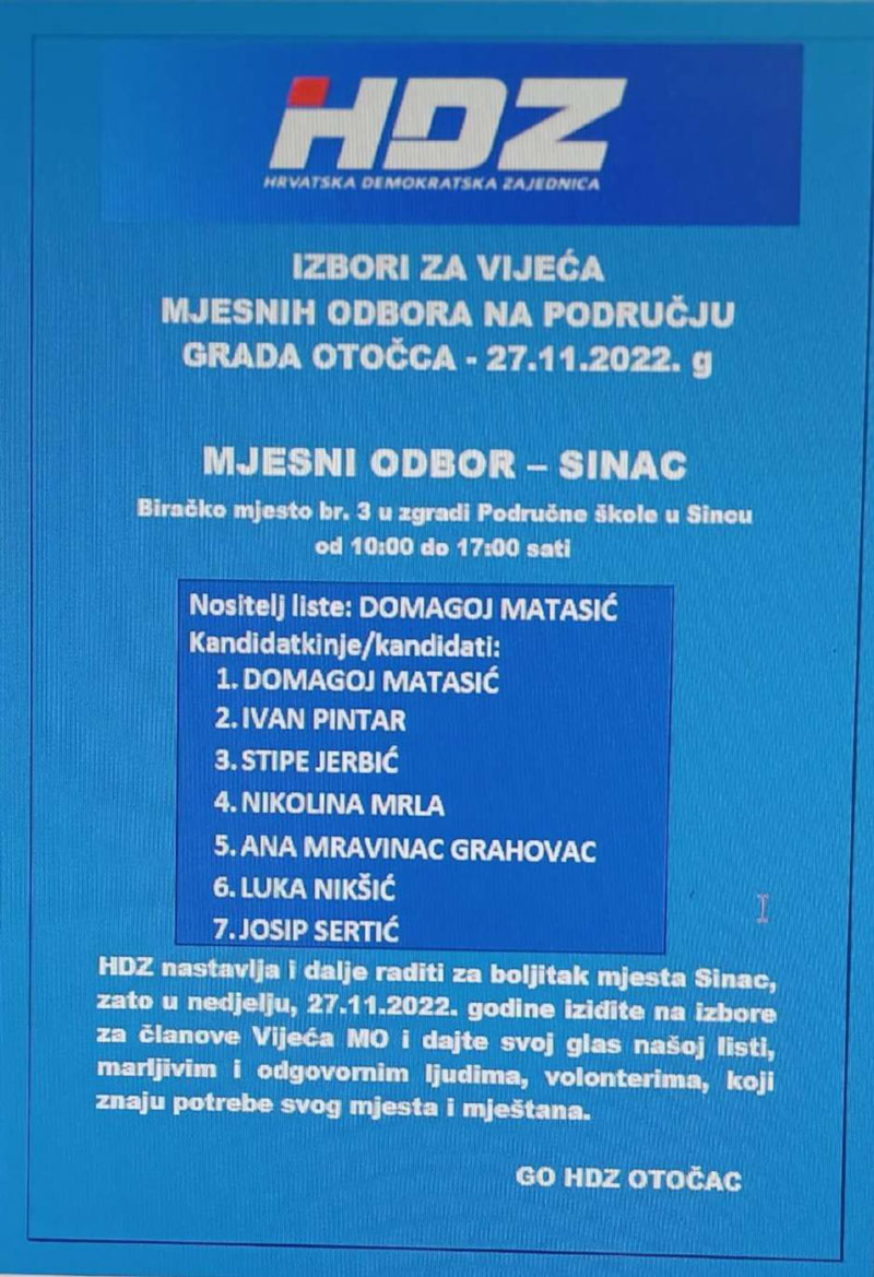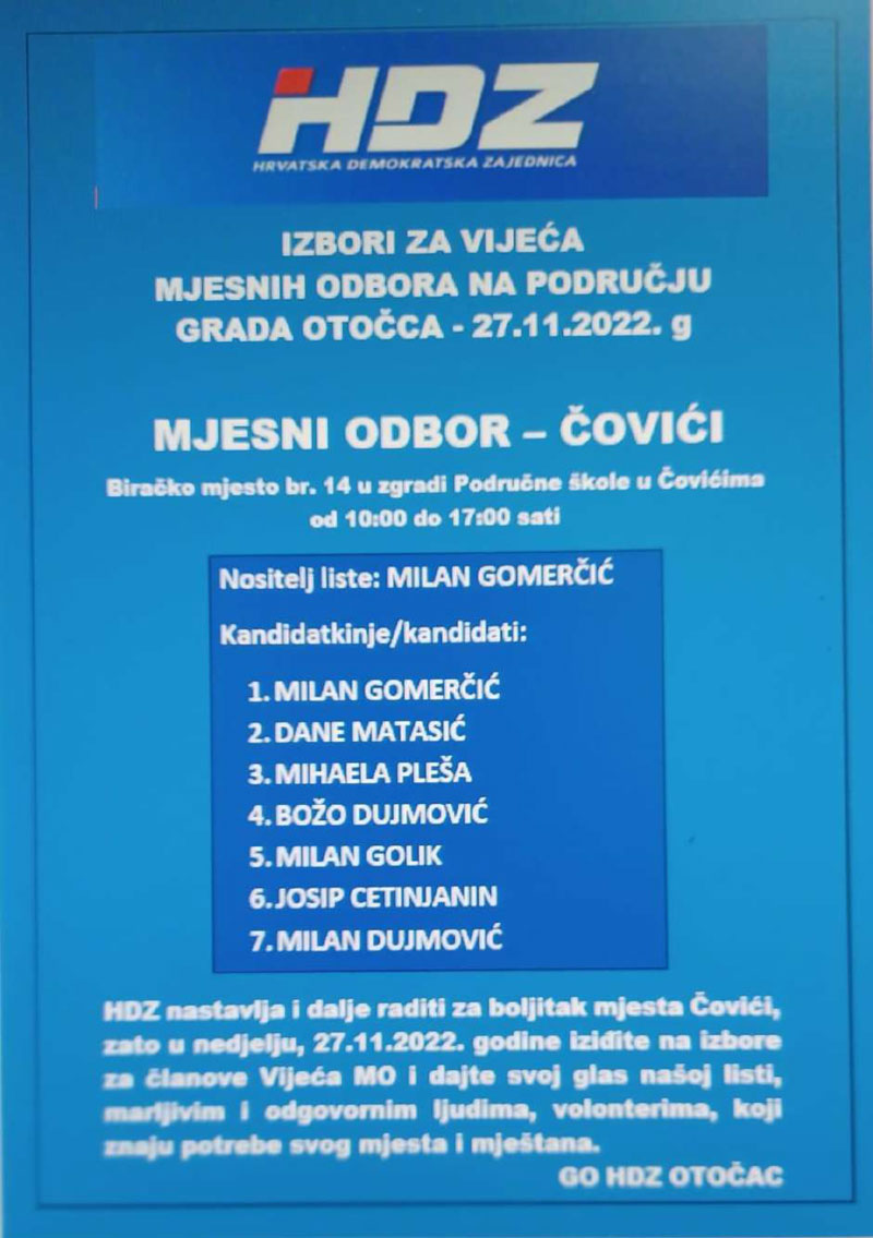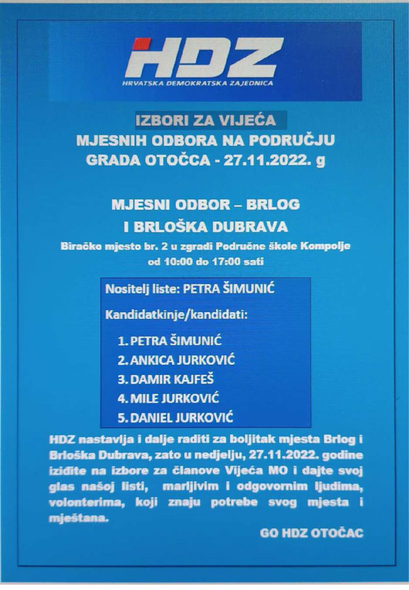 HDZ izlazi samostalno na ove izbore, a svoje kandidacijske liste predao je u 12 Mjesnih odbora od ukupno 17 i to za: Otočac, Ličko Lešće, Čovići, Sinac, Ramljane, Prozor, Švicu, Lipovlje i Goriće, Brlog i Brlošku Dubravu, Hrvatsko Polje, Dabar i Kompolje. Na listama su kandidati – vaši susjedi i mještani, ljudi koje dobro poznajete i koji će se u budućnosti brinuti za boljitak vaše ulice i kvarta, vašeg mjesta, ali i za bolje uvjete života svih naših sugrađana.