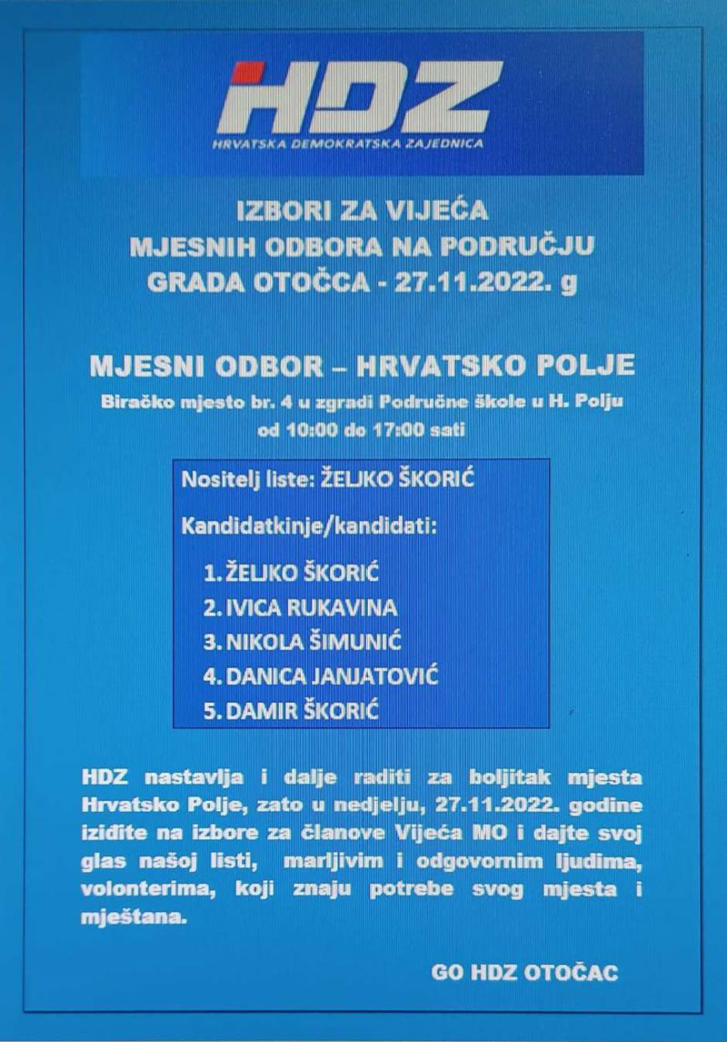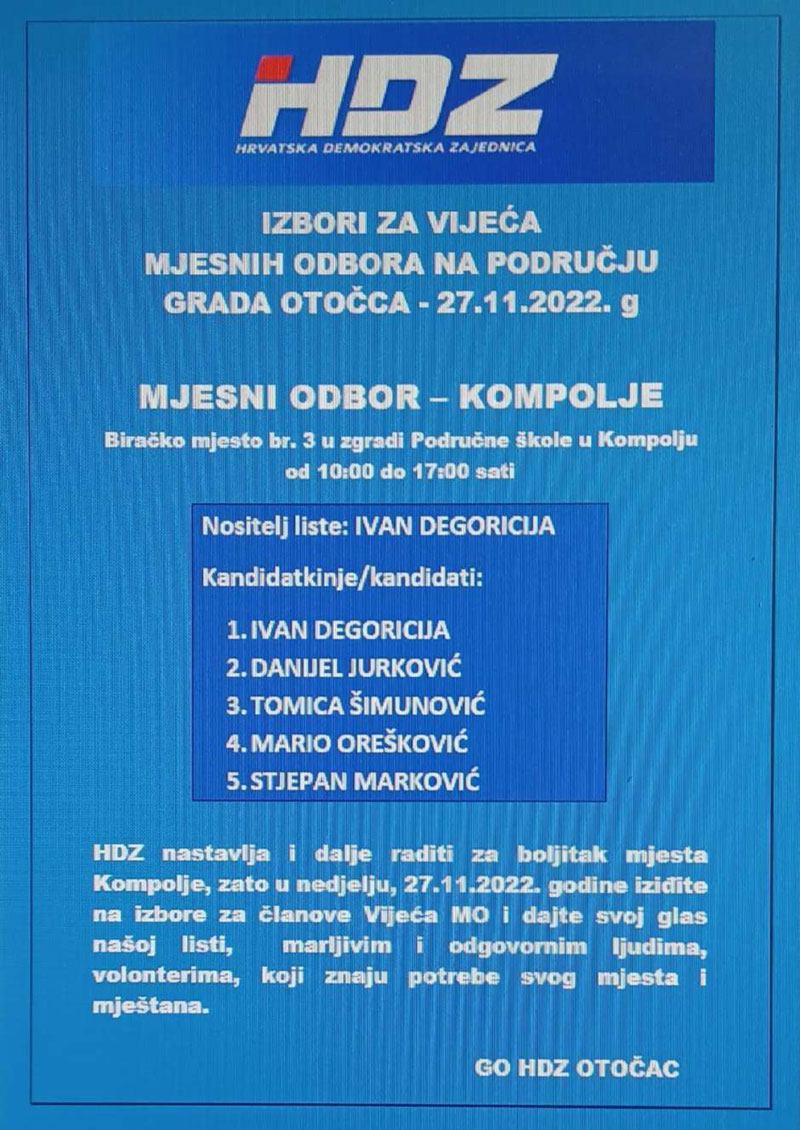 Zato u nedjelju, 27. 11. 2022. godine izađite na izbore za članove vijeća Mjesnih odbora i dajte svoj glas kandidatima Hrvatske demokratske zajednice.