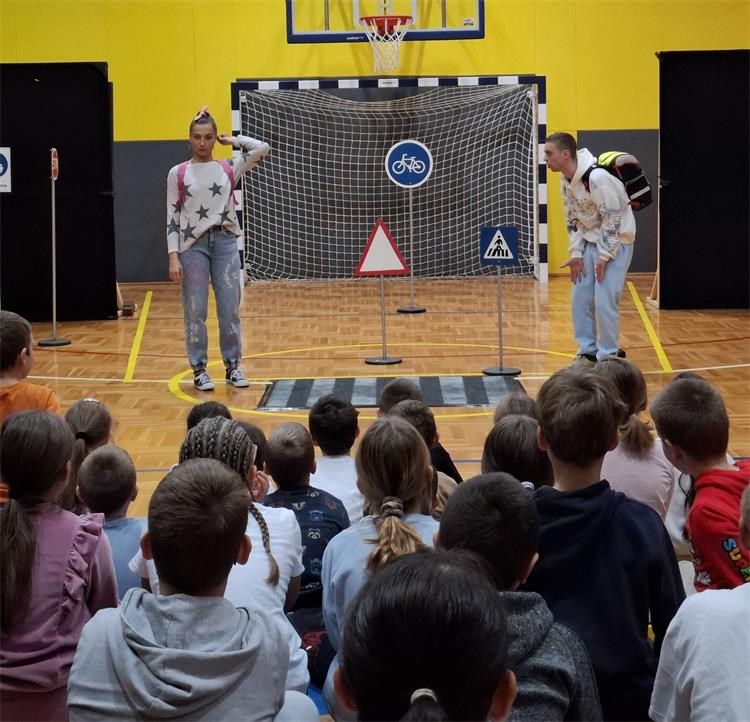 Potom su glumci karlovačkog Gradskog kazališta „Zorin dom“ izveli edukativnu i interaktivnu predstavu “Kata i Nino na putu do škole” te su na ovaj zanimljiv način učenici naučili značenja važnih prometnih znakova, odnosno, stekli su znanja kako se sigurno kretati u cestovnom prometu.