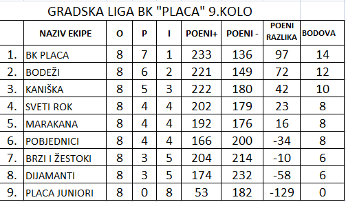 U zaostaloj utakmici 9.kola gradske lige u boćanju na igralištu B.K. “Placa” Marakana je uvjerljivo pobjedila ekipu “Dijamanti” 13:2 13:7. Proljetni prvi dio pripao je najboljoj ekipi “B.K. Placa” a u stopu ih prati ekipa “Bodeži” dok trećeplasirana ekipa “Kaniška” zaostaje za prvoplasiranim 4 boda. Nastavak jesenskog djela koji će početi poslje blagdana Velike Gospe to jest 19 i 20 kolovoza.