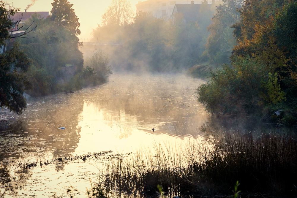 U parkovima je paukova mreža, ovijena rosom, svjetlucala poput srebrne čipke. Drveće u zlatnim i bakrenim tonovima stajalo je nepomično, kao da osluškuje jutro. Na rijeci Novčici, patke su klizile kroz izmaglicu i ispisivale krugove po vodi.