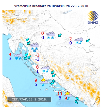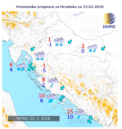 Oblačno uz oborine, te vjetrovito, osobito na sjevernom Jadranu. U unutrašnjosti će povremeno padati snijeg, izraženiji u noći i ujutro, na Jadranu uglavnom kiša, češća prijepodne. U unutrašnjosti će puhati umjeren i ponegdje na udare jak sjeveroistočni vjetar, a na Jadranu umjerena do jaka bura, podno Velebita s olujnim i orkanskim udarima, u južnoj Dalmaciji i jugo. Temperatura zraka na kopnu uglavnom od -3 do 2, u Slavoniji i unutrašnjosti Dalmacije malo viša. Na sjevernom dijelu Jadrana od 4 do 9, a na južnom od 9 do 14 °C.