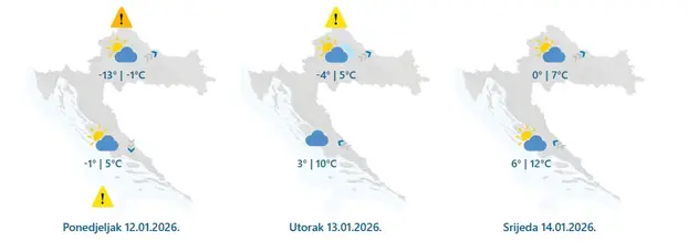 – U ponedjeljak postupno naoblačenje sa zapada. U utorak prevladavajuće oblačno, u unutrašnjosti je rijetko moguća oborina na granici kiše i snijega koja se ponegdje može i smrzavati na podlozi. Češćih sunčanih razdoblja bit će u srijedu. Od utorka mjestimične kiše može biti uglavnom na sjevernom Jadranu i u Gorskoj Hrvatskoj. Vjetar slab do umjeren jugozapadni, na Jadranu i jugo te južni, a još će u ponedjeljak u Dalmaciji puhati umjeren, u prvom dijelu dana i jak sjeverni vjetar. U ponedjeljak ujutro vrlo hladno. Zatim dnevna temperatura u osjetnom porastu, a i jutra će biti manje hladna – stoji u prognozi DHMZ-a…