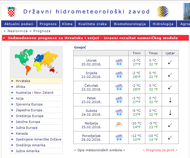 Oblačno uz oborinu. U unutrašnjosti će padati snijeg, češće u Gorskom kotaru i Lici gdje je moguć deblji snježni pokrivač. Na Jadranu će većinom padati kiša, a mjestimice na sjevernom dijelu te u unutrašnjosti Dalmacije povremeno može biti i malo susnježice i snijega. Puhat će umjeren na udare i jak sjeveroistočni vjetar. Na Jadranu umjerena i jaka bura, podno Velebita i olujna, a na jugu i jugo. Najniža jutarnja temperatura zraka između -4 i 0, na Jadranu od 3 do 7 °C. Najviša dnevna od -1 do 3, a na Jadranu između 7 i 11 °C