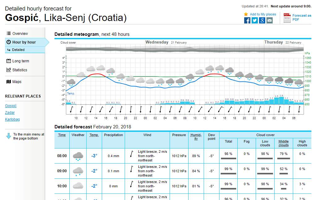 U petak će se djelomice razvedriti, što će dovesti do osjetnog pada temperature, koja će pasti i ispod -10 °C u jutarnjim satima, a dnevne će se zadržati između -3 i 0 °C.