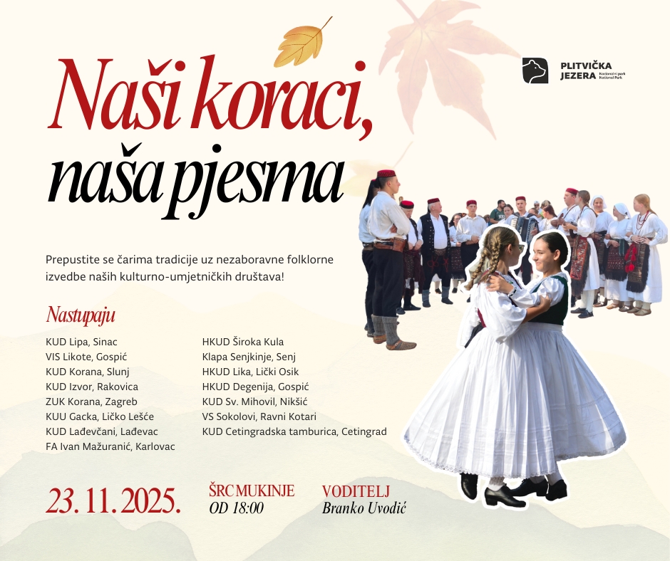 PLITVIČKA JEZERA – U organizaciji Nacionalnog parka Plitvička jezera, u nedjelju 23. studenoga, u Športsko-rekreacijskom centru Mukinje bit će održan koncert tamburaške glazbe pod nazivom Naši koraci, naša pjesma. Program počinje u 18 sati, a ulaz je slobodan za sve posjetitelje.