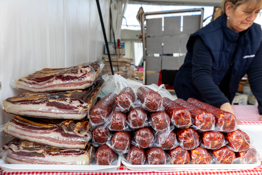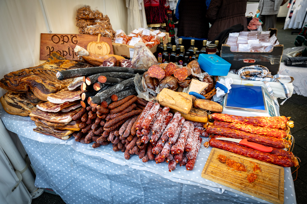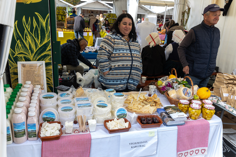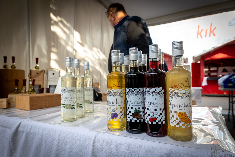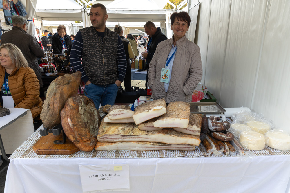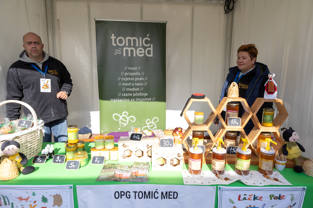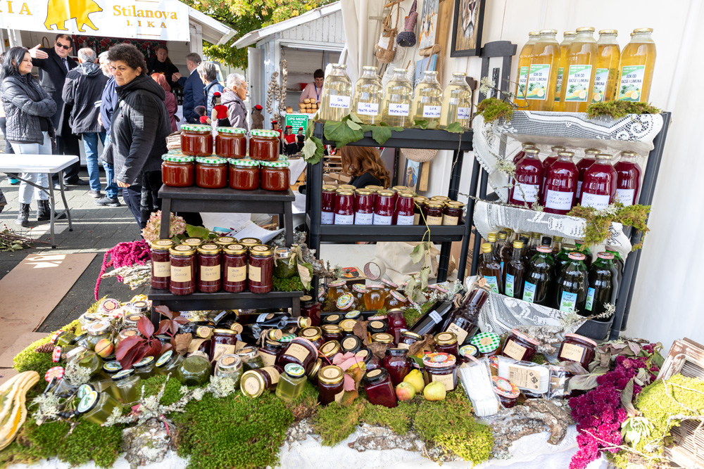 Miris domaćih delicija širio se trgom već na prvim koracima: suhomesnati proizvodi poput špeka, kobasica i pršuta privlačili su gurmane, dok su se na drvenim daskama nudili zalogaji domaće kobasice „za probu“. Samo nekoliko koraka dalje, staklene boce likera, rakija i gina blistale su na prohladnom ličkom suncu, a posjetitelji su rado zastajali kako bi kušali poneki gutljaj, a nešto i ponijeli kući.