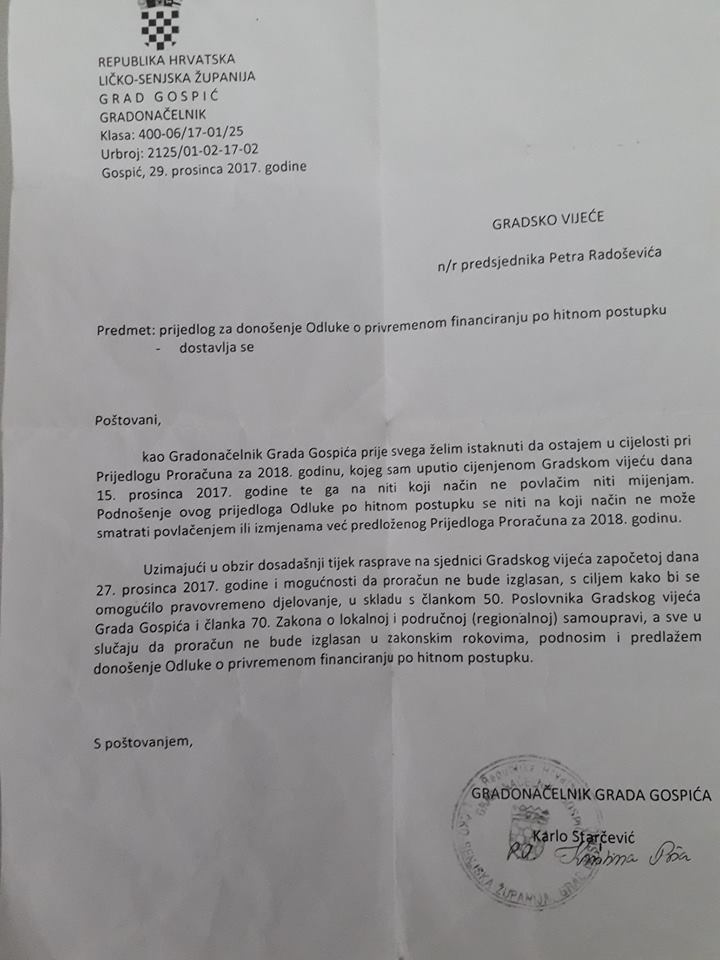 Napominjemo, a što smo izjavili i prilikom izglasavanja Proračuna, da kao većina u Gradskom vijeću ne želimo biti oni koji ruše ili onemogućavaju rad, koji stopiraju neke projekte koje samo gradonačelnik vidi u ovom dokumentu i koji su negdje skriveni kako je i on sam rekao i koje nitko drugi ne vidi!?! Ne želimo biti remetilački faktor, ali šaljemo i jasnu poruku da smo protiv ovakvog Proračuna koji ne nudi ništa građanima. Stoga smo kao Koalicija podigli samo jednu našu ruku kako bi ovaj Proračun koji ne zaslužuje prolaznu ocjenu prošao i koji ide na dušu gradonačelniku koji ga je i predložio. Smatrali smo tada, a i danas da Gospiću ne trebaju novi izbori jer oni neće dovesti do brzog rješenja s obzirom na novi izborni Zakon, ali isto tako moramo poslati jasnu poruku da se gradonačelnikov posao sveo na obmanjivanje javnosti i nerad, šikaniranje zaposlenika, sudske sporove koji će grad dovesti u značajne financijske probleme i paralizu sustava.