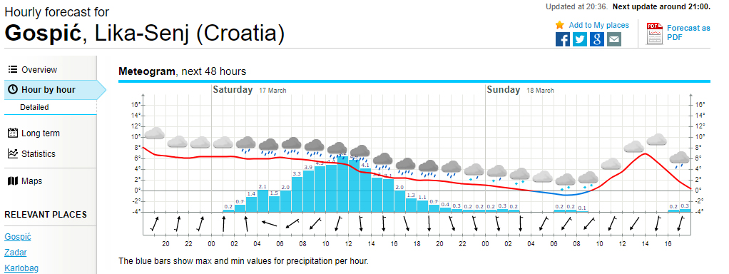 Moguće bujične poplave. količina oborine 40-60 mm BUDITE SPREMNI zaštititi sebe i svoju imovinu. Moguće je poplavljivanje imovine i prometne mreže. Također je moguć prekid opskrbe energijom, prekid komunikacijske mreže kao i opskrbe vodom. Opasni uvjeti za vožnju zbog smanjene vidljivosti te proklizavanja na mokrim kolnicima.