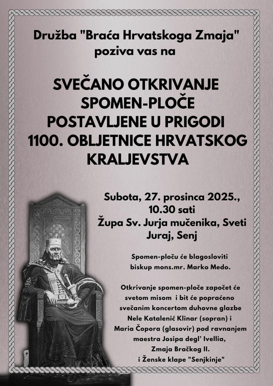 Organizatori pozivaju građane Senja, goste i sve ljubitelje hrvatske povijesti i kulturne baštine da se pridruže obilježavanju 1100. obljetnice Hrvatskoga Kraljevstva i otkrivanja spomen-ploče u Svetom Jurju kraj Senja u subotu, 27. prosinca 2025., s početkom u 10.30 sati.