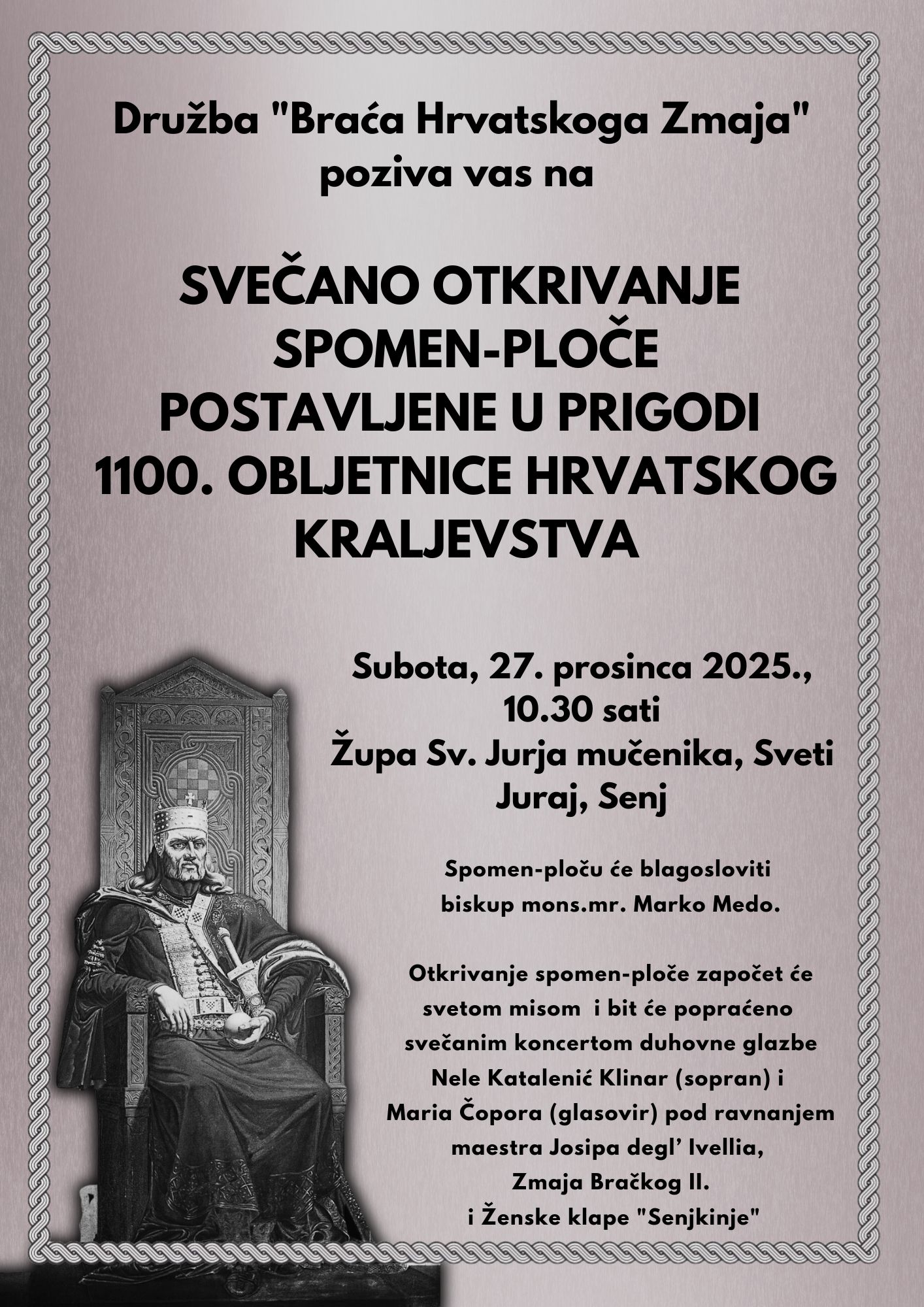 Svečano otkrivanje spomen-ploče u povodu obilježavanja 1100. obljetnice Hrvatskoga Kraljevstva bit će dodatno uveličano svečanim koncertom duhovne glazbe. Nastupit će Nela Katalenić Klinar (sopran), Mario Čopor (glasovir) pod ravnanjem maestra Josipa degl’ Ivellia te Ženska klapa „Senjkinje“, čime će se programu dati osobita umjetnička i duhovna dimenzija.