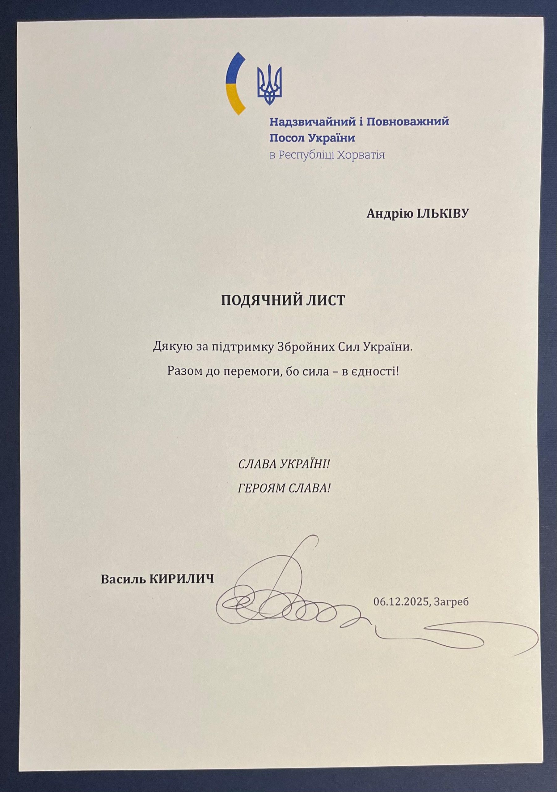 Na kraju događaja upućena je zahvala svim pojedincima i organizacijama koji svakodnevno rade na istom cilju – pobjedi Ukrajine, jačanju države i pružanju potpore Oružanim snagama. Posebna zahvalnost iskazana je Veleposlanstvu Ukrajine u Republici Hrvatskoj i veleposlaniku Vasyli Kyrylychu za izvrsnu organizaciju događaja te za prepoznavanje doprinosa Ukrajinaca i Hrvata koji svojim tihim, ali iznimno važnim djelovanjem doprinose zajedničkom cilju i jačanju solidarnosti.