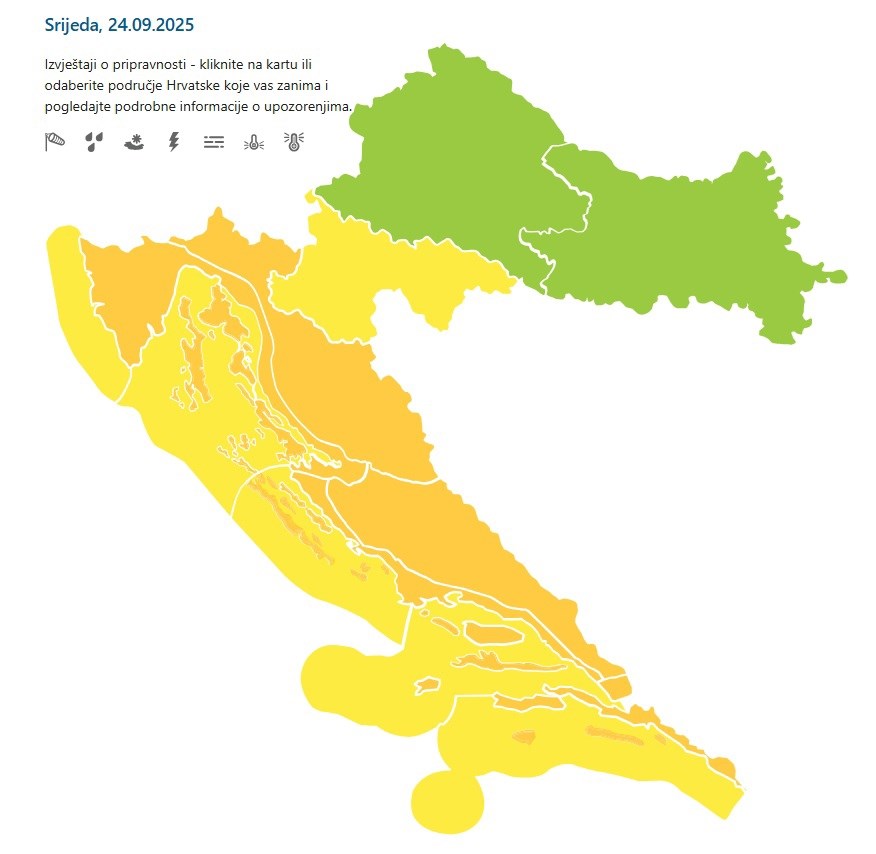DRŽAVNI hidrometeorološki zavod (DHMZ) izdao je za sutra, 24. rujna, narančasto upozorenje zbog grmljavinskog nevremena i obilne kiše.