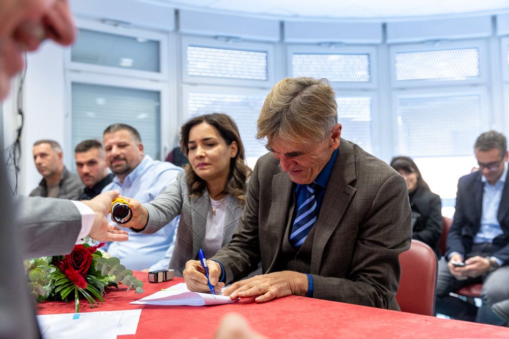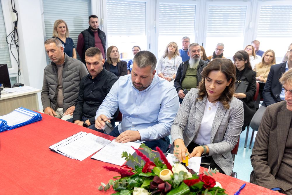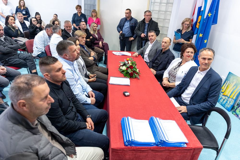 Nakon obraćanja uzvanika uslijedilo je službeno potpisivanje ugovora. Za izvođača radova odabrana je gospićka tvrtka BUBA M d.o.o., u čije je ime ugovor potpisao vlasnik Marijan Marković. Kao podizvođači angažirani su: MATEL d.o.o. za elektroinstalacije, IBS Slađana Božića za fasaderske radove, Totić instalacije d.o.o. za toplinsku podstanicu, radijatore i sustav hlađenja, limarski obrt Jandrić iz Korenice te Termomonting d.o.o. za radove na kotlovnici. Projektantski i stručni nadzor provodi tvrtka Arhingtrade, a koordinator zaštite na radu je NATILLUM d.o.o. iz Vinkovaca, s izvršiteljem dr. sc. Zoranom Pandžom.