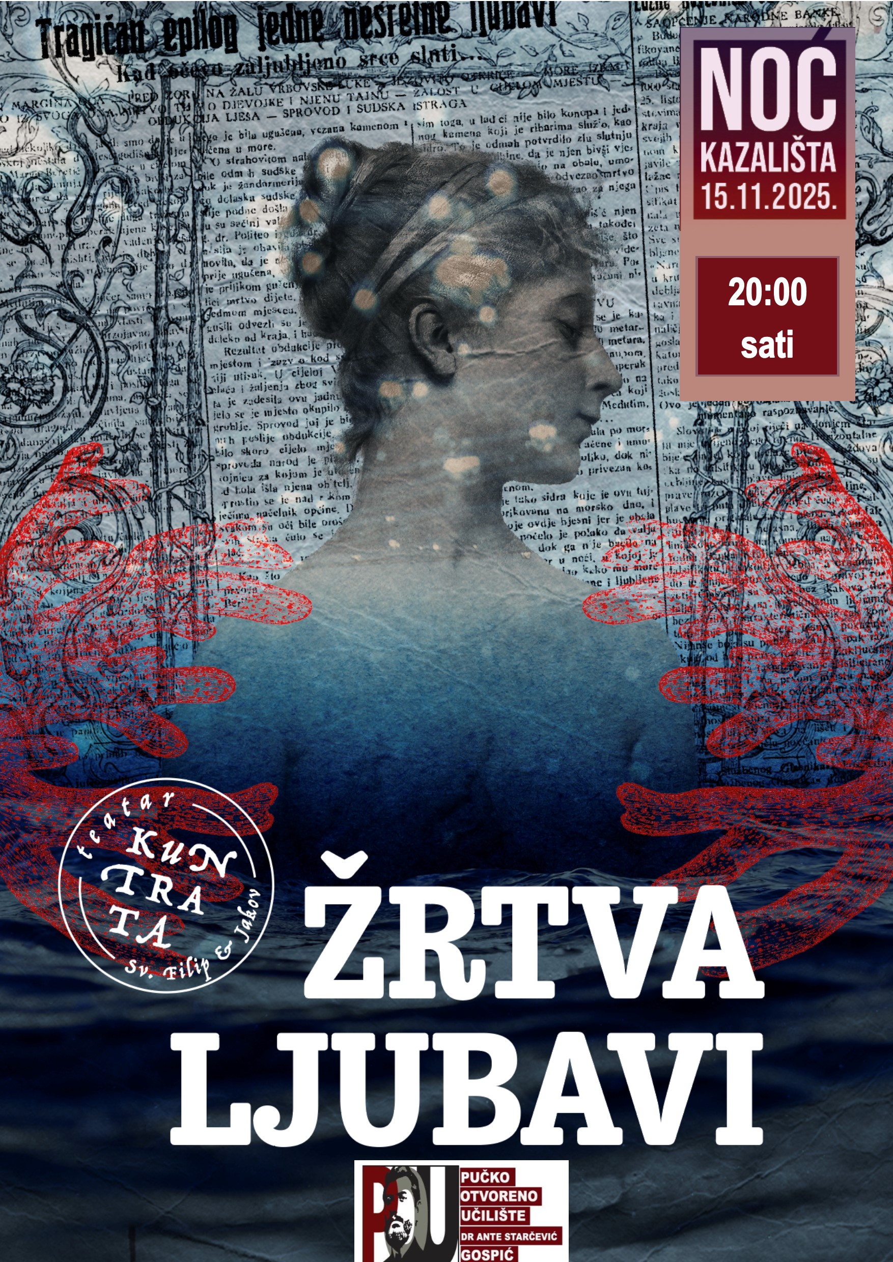 Predstava ‘ŽRTVA LJUBAVI’ temelji se na stvarnom događaju koji se dogodio na otoku Hvaru 1932. godine. Femicid na otoku izazvao je ogorčenje otočana, uzburkao ustaljeni životni hodogram malog ribarskog mjesta i izazvao veliki interes tadašnje javnosti pa je tako o tom zločinu opširno izvještavano i pisano u tadašnjem tisku. Osnovni inspirativni trag izvedbe bazira se na autentičnim sudskim spisima, zapisnicima i tijeku sudskog postupka otkrivanja i osude počinitelja zločina. U izvedbi se koriste citati iz sudskih spisa i ulomci iz Gradske kronike tadašnjih izdanja novina Nova doba koje su izlazile u Splitu.